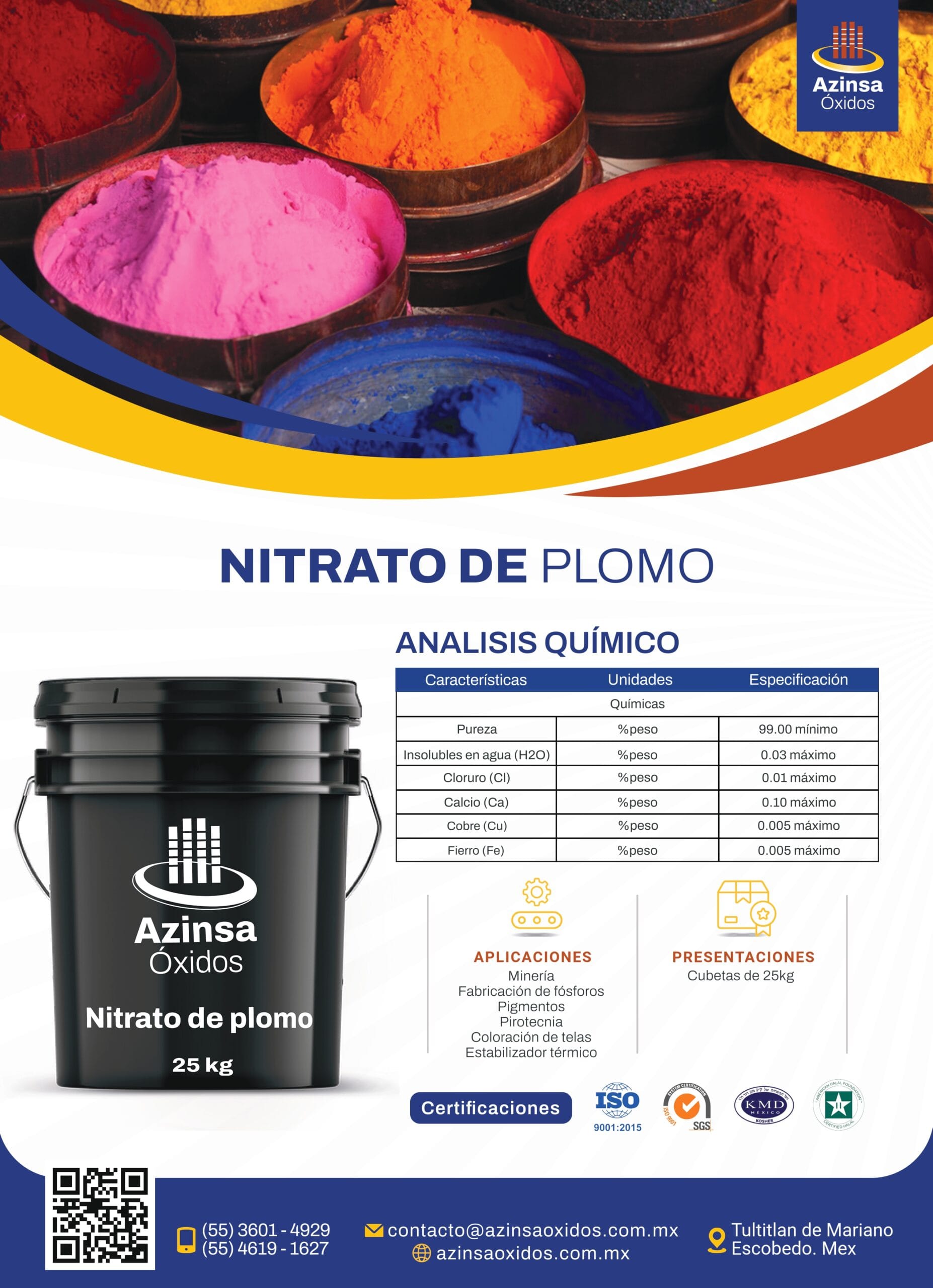 Gracias a su estructura química, el nitrato de plomo actúa como un oxidante fuerte, lo que lo hace especialmente útil en procesos donde se requieren reacciones controladas de oxidación. Su pureza, estabilidad y facilidad de manipulación lo han consolidado como un insumo confiable en industrias como la fabricación de pigmentos, pirotecnia, explosivos, vidrios especiales y otras aplicaciones químicas avanzadas.